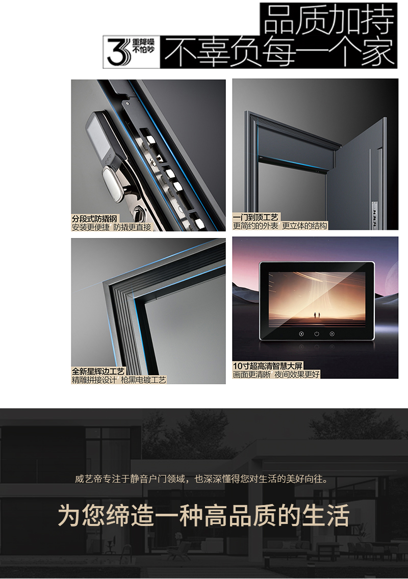 将最真实的体验及科学分析的数据结果带入感性的设计灵感中,让每一个产品的设计轮廓、线条都能联系于生活,不仅给用户更好的视觉感受,还能提供真正的户门美学,从每一个角度都彰显—人为本的精髓。将生产产品的品质标准与国际接轨,有严谨的流程监控,威艺帝户门为保障品质稳定,引进更多专业设备。
